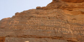 ジュッバの丘は、かつてはふもとに湖をたたえ、ネフド砂漠南部の人々や動物の水源となっていた場所で、その岩肌には当時の人々のつくった多数の岩絵や碑文が残っています。